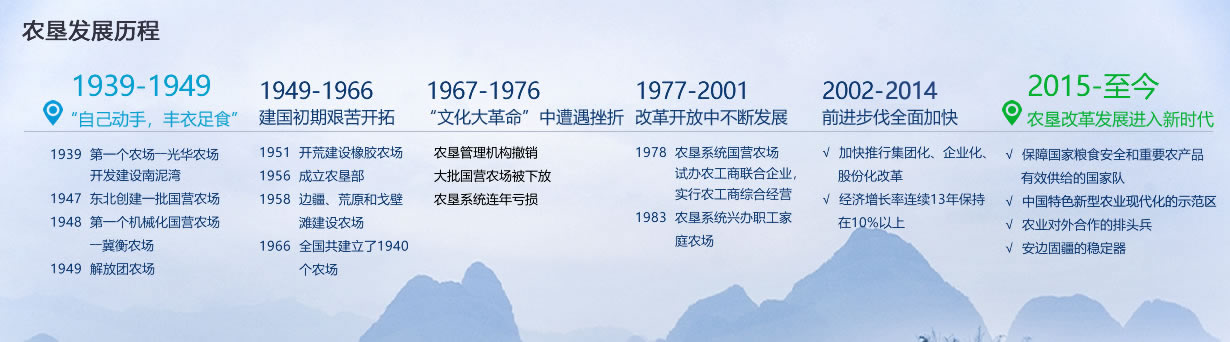 第五階段:農墾改革發(fā)展進入新時代(2015年至今)。2015年11月27日,中共中央、國務院印發(fā)《關于進一步推進農墾改革發(fā)展的意見》。以此為標志,農墾改革發(fā)展進入新時代。文件指出,新形勢下農墾承擔著更加重要的歷史使命。努力把農墾建設成為保障國家糧食安全和重要農產(chǎn)品有效供給的國家隊、中國特色新型農業(yè)現(xiàn)代化的示范區(qū)、農業(yè)對外合作的排頭兵、安邊固疆的穩(wěn)定器。全國農墾貫徹落實中央農墾改革發(fā)展文件精神,用3年左右時間基本完成了農墾國有土地使用權確權登記發(fā)證和改革國有農場辦社會職能任務。墾區(qū)集團化和農場企業(yè)化改革穩(wěn)步推進,建設現(xiàn)代農業(yè)大基地、大企業(yè)、大產(chǎn)業(yè),把農墾建設成為具有國際競爭力的現(xiàn)代農業(yè)企業(yè)集團,努力形成農業(yè)領域的航母。