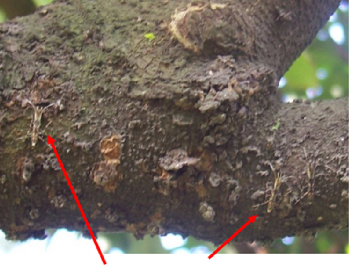 三、檢查藥效,及時(shí)進(jìn)行補(bǔ)藥噴殺。根據(jù)成蟲白天棲于陰涼的樹冠內(nèi)膛枝桿上(如下右圖),受到驚嚇時(shí)會(huì)飛離枝桿這一特性,可每天清晨到果園進(jìn)行實(shí)地調(diào)查,對(duì)荔枝內(nèi)膛的枝桿進(jìn)行拍打(如下左圖),如發(fā)現(xiàn)還有成蟲飛出,2天后再次噴藥。