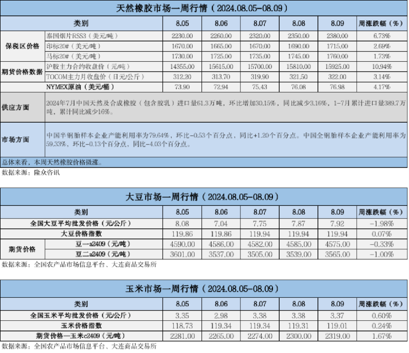 天然橡膠、大豆、玉米市場一周行情(2024.08.05-08.09)