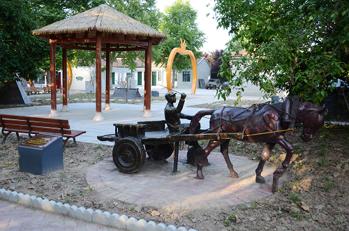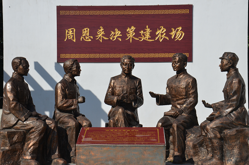 進(jìn)入大院便是奮進(jìn)園,周恩來總理和幾位墾荒者的巨型雕塑矗立其中。巨雕西面是群體雕塑“周恩來決策建農(nóng)場”;東面是一條綠樹掩映的半圓形文化長廊,展出著農(nóng)場各個時期的珍貴照片;南面是“福滿路”,路上錯落分布著五個巨大的蘋果門,每個門上各有一種糧食作物的圖案,寓意平平安安、五谷豐登。福滿路兩側(cè)立著24節(jié)氣石牌。