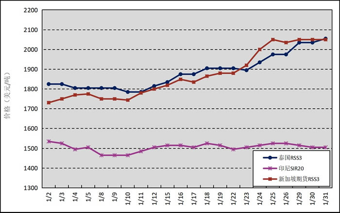 國(guó)外主產(chǎn)區(qū):1月,泰國(guó)RSS3平均價(jià)格為1885美元/噸,環(huán)比上漲158美元/噸,最高價(jià)為2055美元/噸,最低價(jià)為1785美元/噸;印尼SIR20平均價(jià)格為1505美元/噸,環(huán)比上漲71美元/噸,最高價(jià)為1535美元/噸,最低價(jià)為1465美元/噸;新加坡RSS3期貨主力合約月均結(jié)算價(jià)格為1870美元/噸,環(huán)比上漲182美元/噸,最高價(jià)為2050美元/噸,最低價(jià)為1731美元/噸。