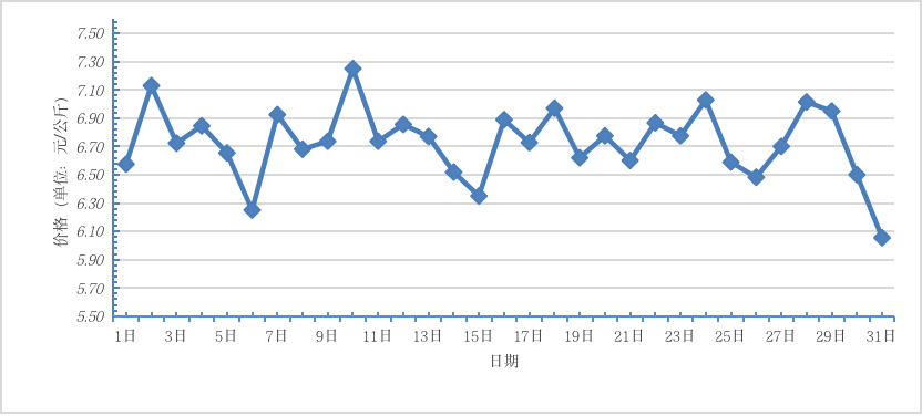 5月,全國重點監(jiān)測農(nóng)產(chǎn)品批發(fā)市場香蕉總交易量達 1.9萬噸,同比下降79.5%,環(huán)比下降9.5%;總交易價值 13750.7萬元,同比下降69.9%,環(huán)比下降17.9%。日平均價格最高為7.3元/千克,最低為6.0元/千克,全月平均價格為 6.7元/千克,同比上漲31.3%,環(huán)比上漲3.1%(每日價格變化如圖)。