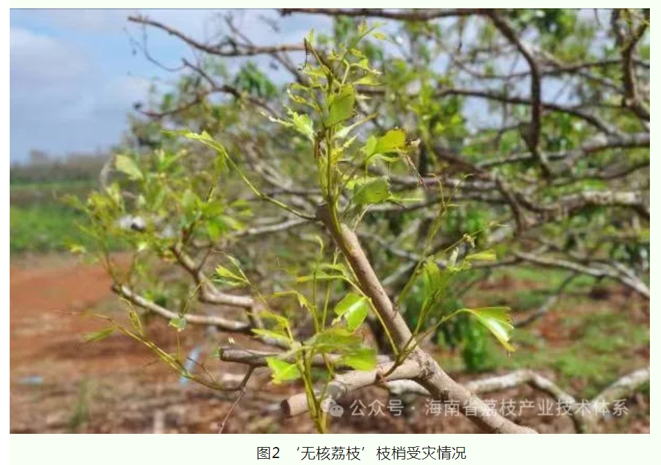 荔枝枝梢生長期正值海南的雨季,臺風活動頻繁。荔枝營養(yǎng)生長期遭遇強風暴雨易造成葉片破損、樹枝折斷,甚至整株倒伏,對荔枝來年的產量形成造成嚴重影響,為有效應對臺風災害對荔枝生產造成的不利影響,提出如下建議: