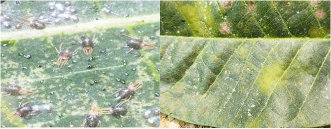 橡膠樹常出現(xiàn)的害螨有黃蜘蛛(六點(diǎn)始葉螨)和紅蜘蛛(東方真葉螨和比哈小爪螨等)。這些害螨有時(shí)呈單一種類發(fā)生,有時(shí)多種同時(shí)發(fā)生,主要以口針刺入植物組織吸取細(xì)胞液而造成危害。受害葉片初期受害點(diǎn)呈灰白色斑點(diǎn),繼而變黃色乃至黃褐色,且受害斑不斷擴(kuò)大,嚴(yán)重時(shí)整個(gè)葉片黃化脫落。高溫干旱及葉片上白粉病等病害引起的殘存病斑加快加重葉片黃化和落葉,致使膠園停割,影響產(chǎn)量。