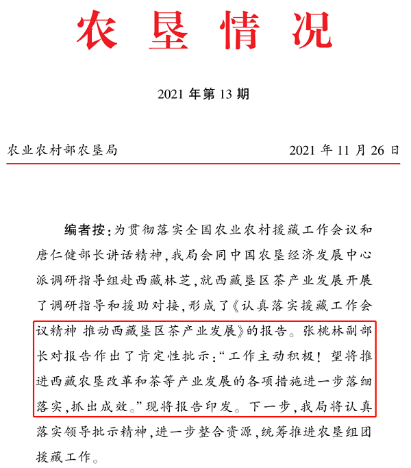4.2021年10月,為貫徹落實全國農(nóng)業(yè)農(nóng)村援藏工作會議精神,經(jīng)濟貿(mào)易處牽頭組織調(diào)研組赴西藏開展專題調(diào)研。通過實地考察林芝市易貢茶場、察隅農(nóng)場等茶業(yè)種植區(qū),形成《認真落實援藏工作會議精神 推動西藏墾區(qū)茶產(chǎn)業(yè)發(fā)展》調(diào)研報告,獲得張?zhí)伊指辈块L肯定性批示。