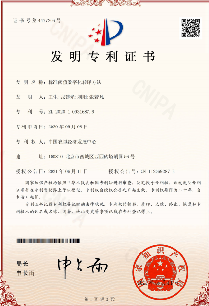 5. 2021年6月,信息服務(wù)處成功申請《標準閾值數(shù)字化轉(zhuǎn)譯方法》專利技術(shù),創(chuàng)造性地將產(chǎn)地環(huán)境標準、生產(chǎn)標準、產(chǎn)品標準等進行數(shù)字化轉(zhuǎn)譯,將書面標準轉(zhuǎn)化為信息系統(tǒng)可識別的數(shù)字標準,從而實現(xiàn)精準質(zhì)量控制。目前已在多家農(nóng)墾企業(yè)的全面質(zhì)量管理數(shù)字化項目中應(yīng)用,涵蓋種植業(yè)、畜牧業(yè)、漁業(yè)等產(chǎn)業(yè),在推動企業(yè)智能化質(zhì)量安全監(jiān)管、提升產(chǎn)品質(zhì)量等方面發(fā)揮了巨大作用。