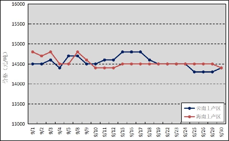 據(jù)農(nóng)業(yè)農(nóng)村部農(nóng)墾局監(jiān)測,9月,泰國3號煙膠片(RSS3)和印尼20號標準膠(SIR20)市場價格月內(nèi)呈穩(wěn)中微降走勢,月均價格環(huán)比分別微跌和微漲。國內(nèi)主銷區(qū)國產(chǎn)全乳標準膠(SCRWF)現(xiàn)貨價格走勢與國外基本一致,全月整體在14250—15400元/噸之間波動,價格重心較上月上移。