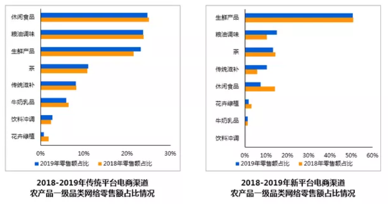 《報告》分析,傳統(tǒng)電商平臺中,農(nóng)產(chǎn)品網(wǎng)絡銷售前三大品類依次為休閑食品、糧油調(diào)味、生鮮產(chǎn)品,占比分別為25%、23.8%、21.5%。但以拼多多為代表的新電商平臺以及新零售渠道中,生鮮產(chǎn)品的網(wǎng)絡零售額占比均超過50%,而傳統(tǒng)電商平臺生鮮產(chǎn)品零售額占比不足25%。