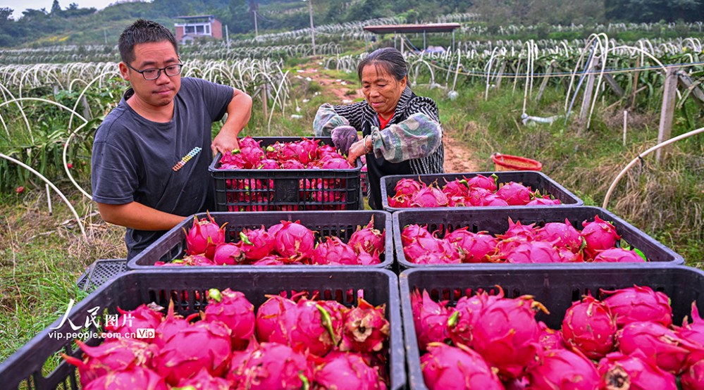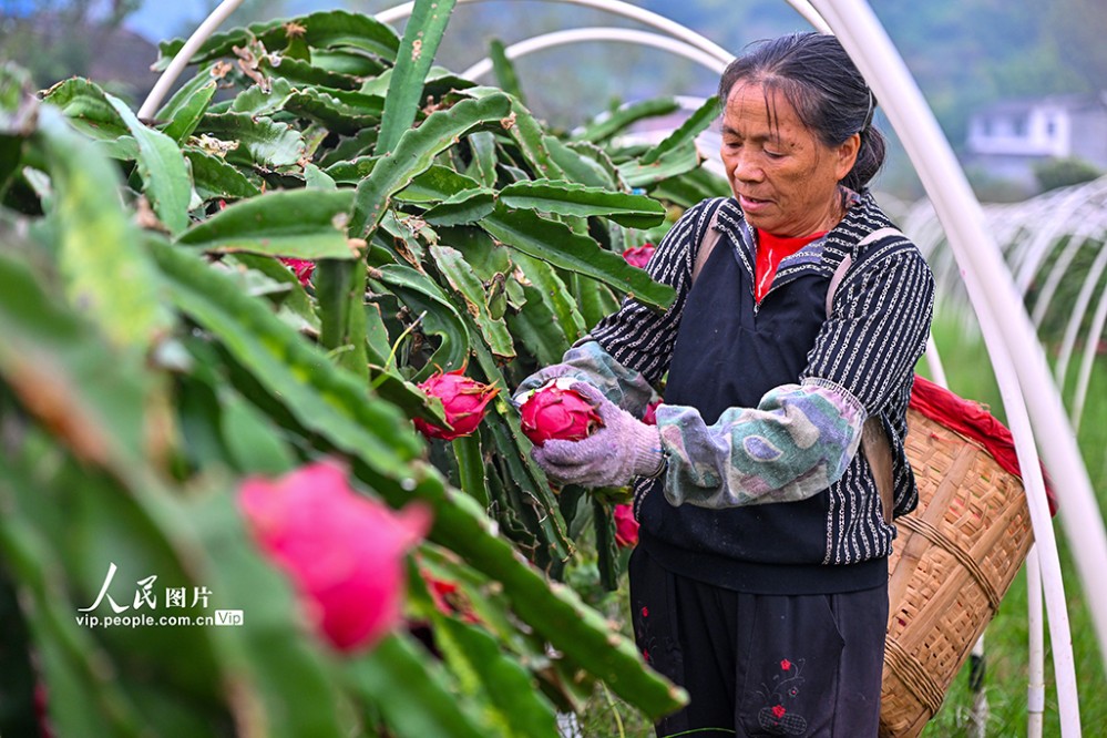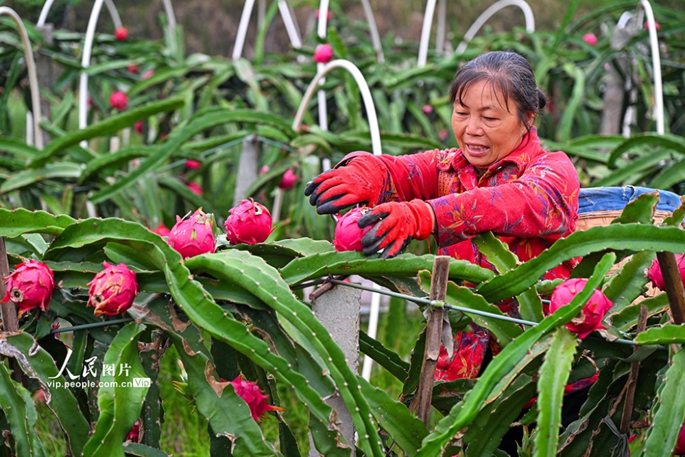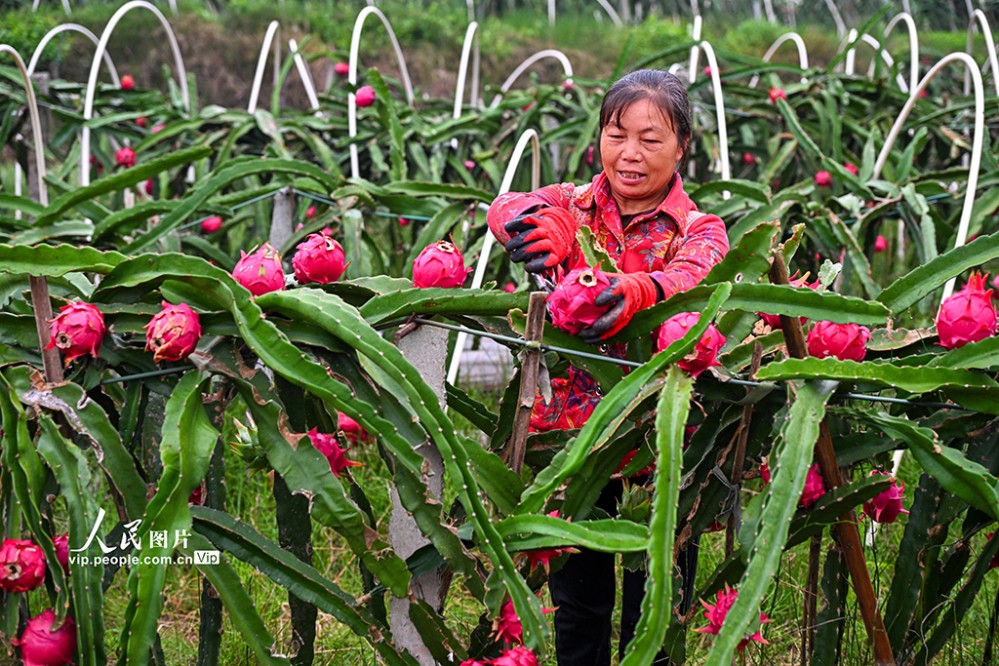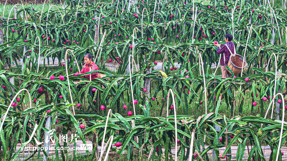 近年來(lái),當(dāng)?shù)匾虻刂埔艘?guī)模化發(fā)展火龍果、櫻桃等特色水果產(chǎn)業(yè),助力土地增效,村民增收。潘帥攝(人民圖片網(wǎng))