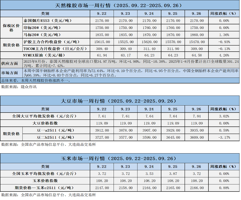 天然橡膠、大豆、玉米市場一周行情(2025.09.22-09.26)