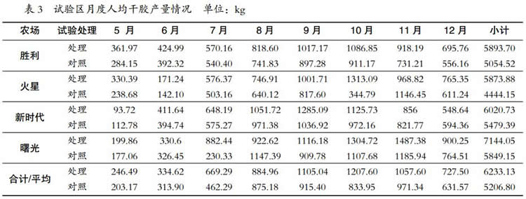 曙光、新時代、勝利和火星 4 個處理區(qū)的人均干膠產(chǎn)量分別為 7144.05 kg、6020.91 kg、5893.70 kg和 5873.88 kg,分別比各自對照高 1294.90 kg/人、541.52 kg/人、 839.18 kg/人和1429.73 kg/人,分別增幅22.14%、9.88%、16.60%和 32.17%。4 個農(nóng)場處理區(qū)合計人均干膠產(chǎn)量 6233.13 kg,比對照高 1026.33 kg/人,增幅 19.71%(表 2)。