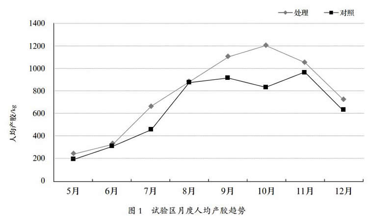 從 2017 年全年的產(chǎn)膠情況分析,處理區(qū)平均株產(chǎn)干膠 2.27 kg/株,比對照平均株產(chǎn)干膠低 0.03 kg/株,減產(chǎn)率 1.3%。預(yù)計通過加強管理和技術(shù)培訓(xùn),可將干膠減幅控制在試驗預(yù)期范圍內(nèi)。