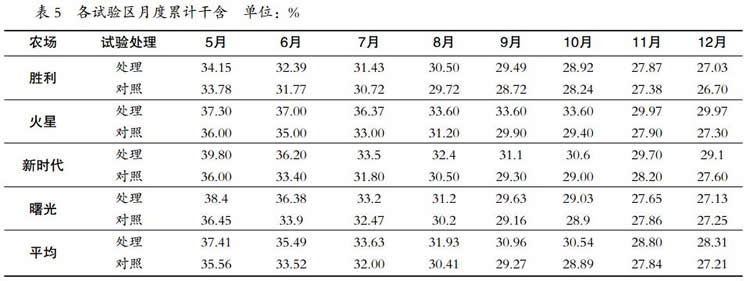 處理區(qū)年平均干含 28.31%,比對照高 1.1 百分點?;鹦?、新時代、曙光和勝利 4 個處理區(qū)的干含依次分別為 29.97%、29.1%、27.13%和 27.03%,分別比各自對照高 2.67、1.5、-0.12、0.33 百分點(表 2)。