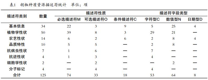 基本信息數(shù)據(jù)對于種質(zhì)資源研究和共享利用至關(guān)重要。按照植物種質(zhì)資源共性描述規(guī)范的原則要求,統(tǒng)一種質(zhì)資源共性信息,統(tǒng)一描述項目。胡椒種質(zhì)資源規(guī)定了34項基本信息描述符,主要包括種質(zhì)圃編號、采集號、引種號、種質(zhì)名稱、科名、屬名、學(xué)名、種質(zhì)類型、主要特性、主要用途、系譜、育種手段、繁殖方式、采集地、保存單位、圖像和鑒定評價機(jī)構(gòu)等,涉及征集、保存、主要特征、用途及共享等多方面內(nèi)容。由于胡椒種質(zhì)資源在國內(nèi)外均有分布,且野生近緣種資源占有較大比例,因此條件描述符5項,主要涉及采集地位置信息以及引種號和引種外文名,其余29項為必選描述符,均是具有共性的種質(zhì)基本特征及主要特征等(表1)。