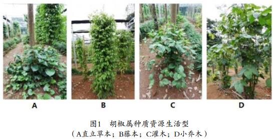 胡椒植物學(xué)特征描述符主要從植株、莖、葉、花和花序、果和果序、種子等特征特性進(jìn)行分別描述,共51項,主要包括生活型、株高、冠幅、莖顏色、分枝特性、葉顏色、葉形、葉脈類型、葉脈數(shù)量、葉背被毛、花序形狀、苞片形狀、雄蕊數(shù)量、柱頭數(shù)量、果序長度、果實著生情況及種子千粒重等。對于質(zhì)量性狀描述,通過盡可能多的調(diào)查不同種質(zhì)資源,采集標(biāo)本并拍照作圖,采用歸納整理和分類的方法,把同一性狀的不同表現(xiàn)形態(tài)進(jìn)行列項,并通過圖像形式進(jìn)行直觀顯示,使該標(biāo)準(zhǔn)具有較好的實用性和可操作性。對于數(shù)量性狀描述,確定測量方法,并根據(jù)資料、實地測量,分析數(shù)據(jù)后給出評價指標(biāo)。在確定描述符時,生活型、葉脈類型、葉脈數(shù)量、果序長度、苞片形狀和果實著生情況等指標(biāo)具有一定的特殊性。由于復(fù)雜起源和快速分化,胡椒屬內(nèi)極高的物種多樣性使其成為基部被子植物中最大的屬之一,物種多樣性極為豐富[13],植株外貌特征類型多樣,如原產(chǎn)于南美洲的毛葉樹胡椒(P. hispidinervium)等為小喬木,苧葉蒟(P. boehmeriaefolium)、樟葉胡椒(P.polysyphorum)等為灌木,胡椒(P. nigrum)、短蒟(P.mullesua)等為木質(zhì)藤本,蓽菝(P. longum)等為草質(zhì)藤本,而假蒟(P. sarmentosum)、P.auntum等為直立草本,因此將生活型作為描述及評價指標(biāo),并根據(jù)植株外觀特征確定了4種類型(圖1)。