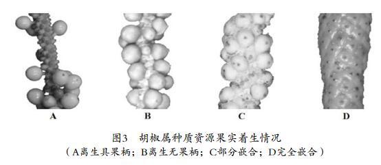 果序長度是產(chǎn)量相關(guān)的一個重要副性狀。由于胡椒屬物種的多樣性,果序長度也表現(xiàn)出了極高的差異性,如球穗胡椒(P.thomsonii)等種質(zhì)果穗不足2厘米,而大葉蒟(P.laetispicum)和短柄胡椒(P.stipitiforme)果穗可長達(dá)25厘米以上,因此將果序長度分為極短、短、中、長、極長共5個類別(表2)。果實著生情況是指果實在果序軸上的著生情況,胡椒屬物種的果實著生情況具有一定差異,如大葉蒟等果實與果序軸離生并具果柄,山蒟(P. hancei)等果實與果序軸離生但不具果柄,華南胡椒(P. austrosinense)等果實部分嵌合在果序軸中,而假蓽菝(P. retrofractum)等果實完全嵌合在果序軸中,據(jù)此確定了4種果實著生情況(圖3)。