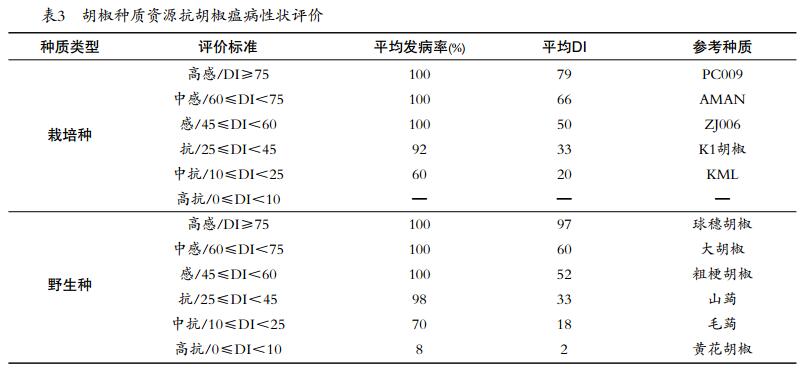 抗病蟲種質(zhì)資源挖掘利用可提高栽培品種抗病蟲特性,是實現(xiàn)生態(tài)、綠色乃至有機(jī)栽培的物質(zhì)基礎(chǔ)。胡椒抗病蟲性狀描述符共7項,其中胡椒瘟病抗性為必須描述符,其他6項為可選描述符。胡椒瘟病是由辣椒疫霉菌(Phytophthora capsici)引起的一種氣候依賴型、傳染力很強(qiáng)的土傳性病害,目前尚未選育出有效的抗病品種[13]。我國胡椒主栽品種屬于易感瘟病品種,生產(chǎn)上仍采取預(yù)防為主、綜合防治為輔的措施,勞動力成本高[15]。研究者一直都把胡椒瘟病抗性列為主要育種目標(biāo)。近20年來,中國熱帶農(nóng)業(yè)科學(xué)院香料飲料研究所等單位開展了胡椒種質(zhì)資源瘟病抗性鑒定研究,離體葉片針刺接種法操作簡單有效,且評價結(jié)果與其他方法的測定結(jié)果基本一致[5]。選擇植株中部最外側(cè)小枝頂芽下第3~5片、無病蟲害、生長正常的穩(wěn)定葉片,洗凈后消毒處理;分離病原菌,純化培養(yǎng)獲得致病菌株,經(jīng)培養(yǎng)基28℃培養(yǎng)后,配成孢子濃度為10萬~100萬個/mL的懸浮液;用束針刺傷葉片,將接種菌液均勻噴灑在葉片正反面,28℃保濕培養(yǎng),調(diào)查病情,制定免疫(I)、高抗(HR)、抗(R)、中抗(MR)、感(S)和高感(HS)共6級抗病性評價標(biāo)準(zhǔn)(表3)。