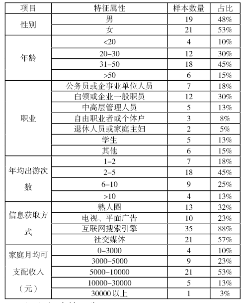 通過深度訪談形成基本的測(cè)試樣本,受訪者中,企事業(yè)單位職工和白領(lǐng)占48%;年均出游次數(shù)以2-5次居多,占45%;習(xí)慣利用互聯(lián)網(wǎng)搜索、社交媒體獲取信息?;緦傩砸娤卤?。