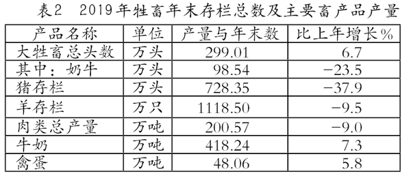 畜牧業(yè)占農(nóng)業(yè)總產(chǎn)值比重23.0%,比上年增長2.6個百分點。牲畜年末存欄總數(shù)及主要畜產(chǎn)品產(chǎn)量見表2。