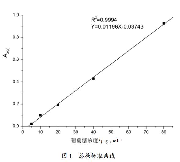 參照文獻[5]方法并稍作修改:分別配置濃度為 5、10、20、40、80μg/mL 的葡萄糖標準溶液。吸取 2 mL 各濃度溶液分別置于 10 mL 具塞試管中,向各管試液中加入 1.0 mL 5%苯酚溶液,然后快速加入 5.0 mL 濃硫酸,混合均勻后室溫放置 30 min。取適量反應(yīng)液用紫外-可見分光光度計于 490 nm 處測定吸光值。以葡萄糖質(zhì)量濃度為橫坐標,吸光值為縱坐標,繪制標準曲線。稱取約 0.25 g 試樣,水解后按以上步驟操作,以空白溶液調(diào)零,測得待測液的吸光值,以標準曲線計算總糖含量(圖 1)。