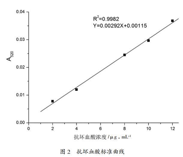參照文獻[6]方法測定面包果中抗壞血酸含量:①標準曲線。配制濃度為 1 mg/mL 的抗壞血酸標準溶液,取該標準溶液50 mL 于錐形瓶中,加入 2 g 活性炭,振搖 2 min 后過濾,棄除初濾液,收集濾液備用。以上述濾液分別配制濃度為 2、4、8、10、12μg/mL 的抗壞血酸標準溶液。吸取 4 mL 各濃度溶液分別置于 10 mL 具塞 試 管 中 , 除 空 白 管 外 , 往 其 他 各 試 管 中 分 別 加入 1.0 mL 2,4-二硝基苯肼,搖勻后將所有試管置于 37 ℃±0.5 ℃ 水浴鍋中保溫 3 h,除空白管外,其他各試管置于冰水中。空白管冷卻至室溫后,往試液中加入 1 mL 2,4-二硝基苯肼溶液,室溫放置 15 min 左右后置于冰水中,然后往所有試管中分別加入5 mL 濃硫酸,滴加時間控制在 1 min,邊加邊振搖試管。硫酸加入完畢后,將試管由冰水中取出,室溫下準確放置 30 min,用紫外-可見分光光度計在 520 nm 處測定各組試液的吸光值。以抗壞血酸質(zhì)量濃度為橫坐標,吸光值為縱坐標,繪制標準曲線。②樣品制備及測定。鮮樣制備,稱 10 g 鮮樣和 10 g 草酸(20 g/L)于研缽中,搗成勻漿,轉(zhuǎn)移到 100 mL 容量瓶中,用草酸(10 g/L)稀釋至刻度,搖勻。過濾,取濾液備用;干樣制備,稱取 1~4 g 樣品于研缽中,用草酸(10 g/L)磨成勻漿,轉(zhuǎn)入 100 mL 容量瓶中,定容,搖勻。過濾,取濾液備用;氧化處理,取 25 mL 上述濾液于錐形瓶中,加入 2 g 活性炭,振搖 2 min 后過濾,棄去初濾液,取 10 mL 此氧化提取液,加入 10 mL 硫脲溶液(20 g/L)混合均勻,備用。測定上述氧化稀釋液的吸光值,以標準曲線計算抗壞血酸含量(圖 2)。