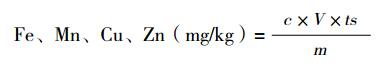 1.2.8.3  樣品測定。Ca、Mg 測定,吸取母液1 mL 至 50 mL 容量瓶中,加入 5%氯化鍶溶液 2 mL,用去離子水定容,用原子吸收分光光度計測定;Fe、Mn、Cu、Zn 含量測定,F(xiàn)e、Mn、Cu、Zn 原液上機,用原子吸收分光光度計測定。