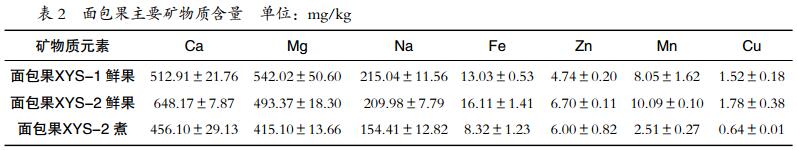 由表 2 可知,面包果中含有豐富的礦物質(zhì)和微量元素,尤其是 Ca、Mg 含量較高,要明顯高于其他礦物質(zhì)的含量。此外,面包果還含有 Fe、Zn、Mn、Cu 等人體必需微量元素。對比面包果的 2 個品系XYS-1 和 XYS-2,礦物質(zhì)含量存在一定的差異,但是差別不大。面包果XYS-1鮮果和面包果 XYS-2 鮮果中 Ca、Mg、Na、Fe、Zn、Mn、Cu 礦物質(zhì)含量分別為 512.91±21.76、542.02±50.60、215.04±11.56、13.03±0.53、4.74±0.20、8.05±1.62、1.52±0.18 mg/kg 和 648.17±7.87、493.37±18.30、209.98±7.79、16.11±1.41、6.70±0.11、10.09±0.10、1.78±0.38 mg/kg;平均含量分別為 580.54、517.69、212.51、14.57、5.72、9.07、1.65 mg/kg。面包果 XYS-2 鮮果經(jīng)過煮的烹飪方式處理后,礦物質(zhì)總體呈現(xiàn)下降趨勢(表 2),與 Khempaka S[7]報道的食品加工后礦物質(zhì)元素含量會減少相一致。烹飪處理后 XYS-2 鮮果中礦物質(zhì)總體下降可能跟煮制過程中果肉結(jié)構(gòu)受熱破壞,果肉細胞內(nèi)細胞液流出有關(guān)。