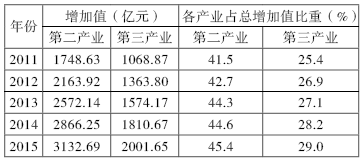 《中國(guó)農(nóng)墾統(tǒng)計(jì)年鑒》顯示,從2011年至2015年,農(nóng)墾系統(tǒng)二三產(chǎn)業(yè)增加值持續(xù)上升,2014年起第三產(chǎn)業(yè)的增加值占比超越了第一產(chǎn)業(yè)。詳見(jiàn)表1。