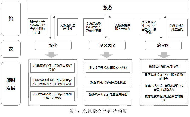 農(nóng)旅融合是農(nóng)業(yè)、墾區(qū)居民、農(nóng)墾區(qū)三者分別與旅游進(jìn)行深度結(jié)合,是一種新型的鄉(xiāng)村產(chǎn)業(yè)形態(tài)和消費(fèi)形態(tài)。在充分發(fā)揮農(nóng)業(yè)生產(chǎn)功能的前提下,合理開(kāi)發(fā)墾區(qū)生態(tài)資源、土地資源、勞動(dòng)力資源等生產(chǎn)要素,開(kāi)發(fā)休閑農(nóng)業(yè)、鄉(xiāng)村旅游、農(nóng)旅地產(chǎn)、康體療養(yǎng)等核心配套項(xiàng)目,使農(nóng)墾資源與旅游產(chǎn)業(yè)互相促進(jìn),相輔相成,共同加快農(nóng)墾供給側(cè)結(jié)構(gòu)性改革,繁榮墾區(qū)經(jīng)濟(jì)。詳見(jiàn)圖1。