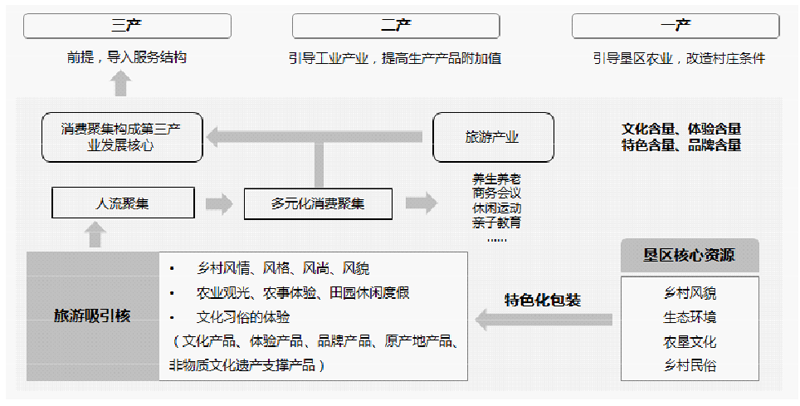 農(nóng)墾系統(tǒng)的“321”全產(chǎn)業(yè)鏈發(fā)展模式,強(qiáng)調(diào)三產(chǎn)之間的互動(dòng)效率和產(chǎn)業(yè)能力提升。這一模式以墾區(qū)核心資源的分析挖掘?yàn)槠瘘c(diǎn),通過(guò)對(duì)資源的特色化、產(chǎn)品化包裝形成旅游產(chǎn)業(yè)的吸引核,以聚集人氣,形成旅游引導(dǎo)的消費(fèi)聚集,并引致消費(fèi)產(chǎn)業(yè)的就業(yè)供給側(cè)聚集,形成以旅游產(chǎn)業(yè)為核心的三產(chǎn)服務(wù)結(jié)構(gòu),進(jìn)而引導(dǎo)加工產(chǎn)業(yè)發(fā)展,帶動(dòng)墾區(qū)農(nóng)業(yè)發(fā)展方式轉(zhuǎn)型升級(jí)。